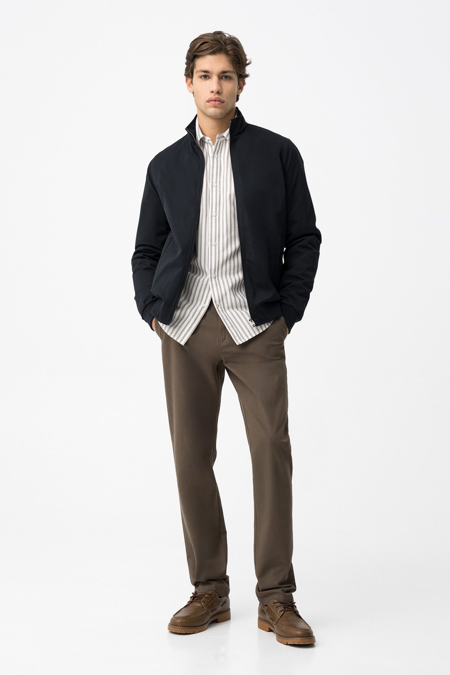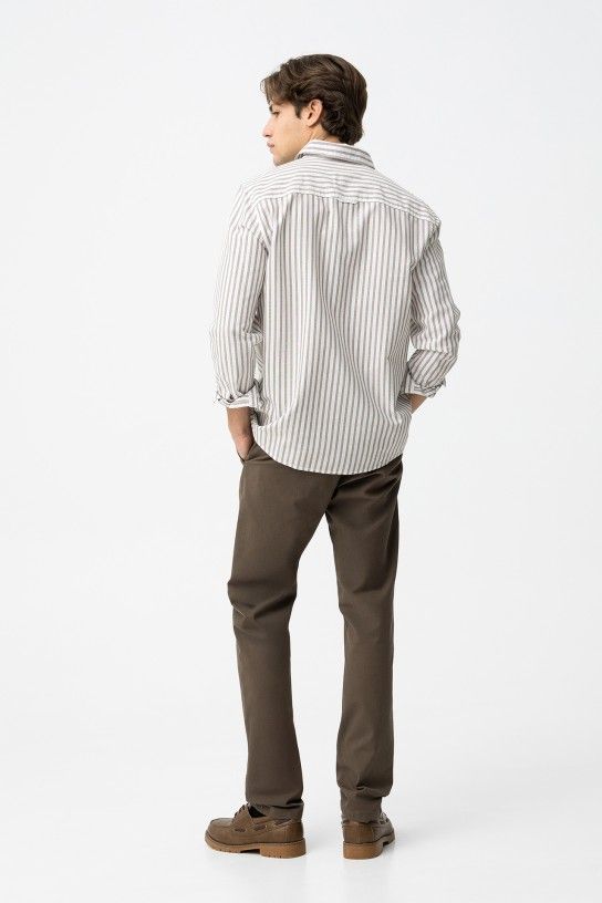 Calças slim fit com cinco bolsos. Fecho frontal de correr e botão.