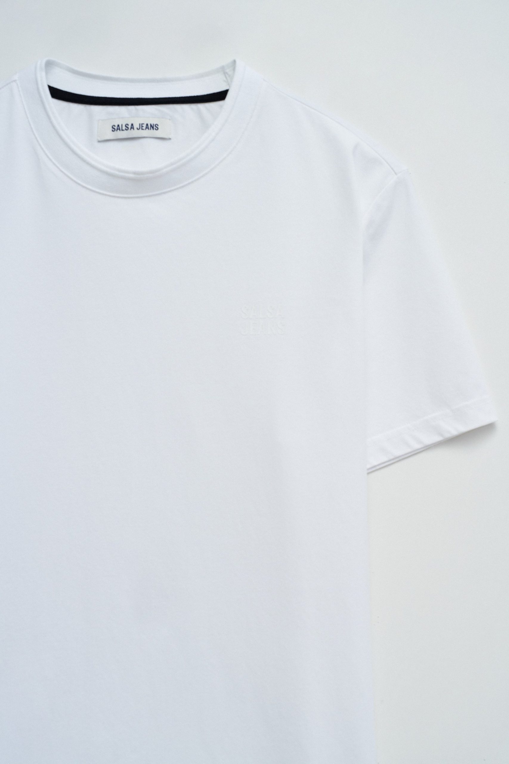 T-shirt em tom branco, com design minimalista e branding que acrescenta um toque contemporâneo. O corte slim garante conforto, ideal para combinar com qualquer look casual. Confecionada em tecido macio, apresenta mangas curtas e decote redondo clássico.