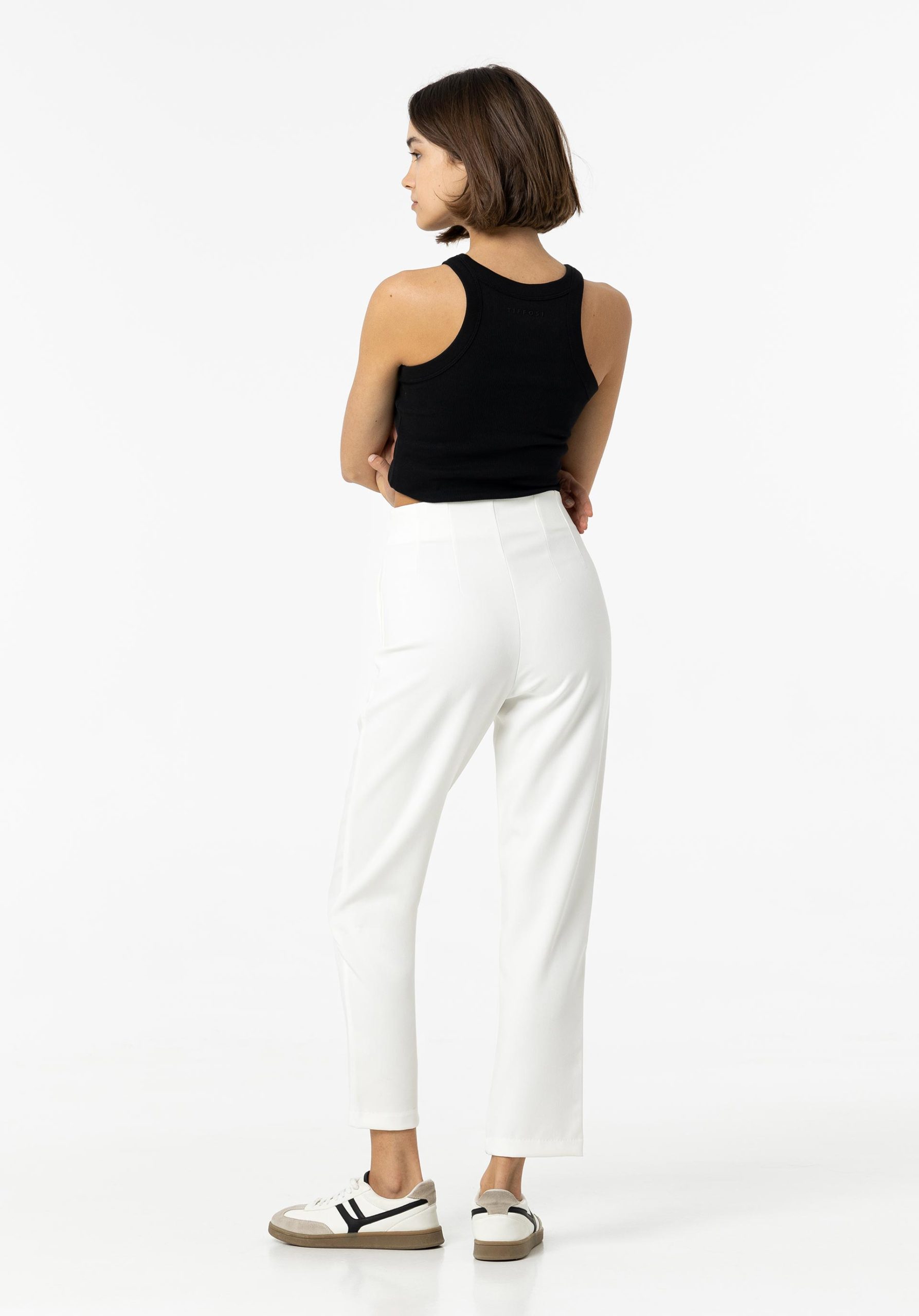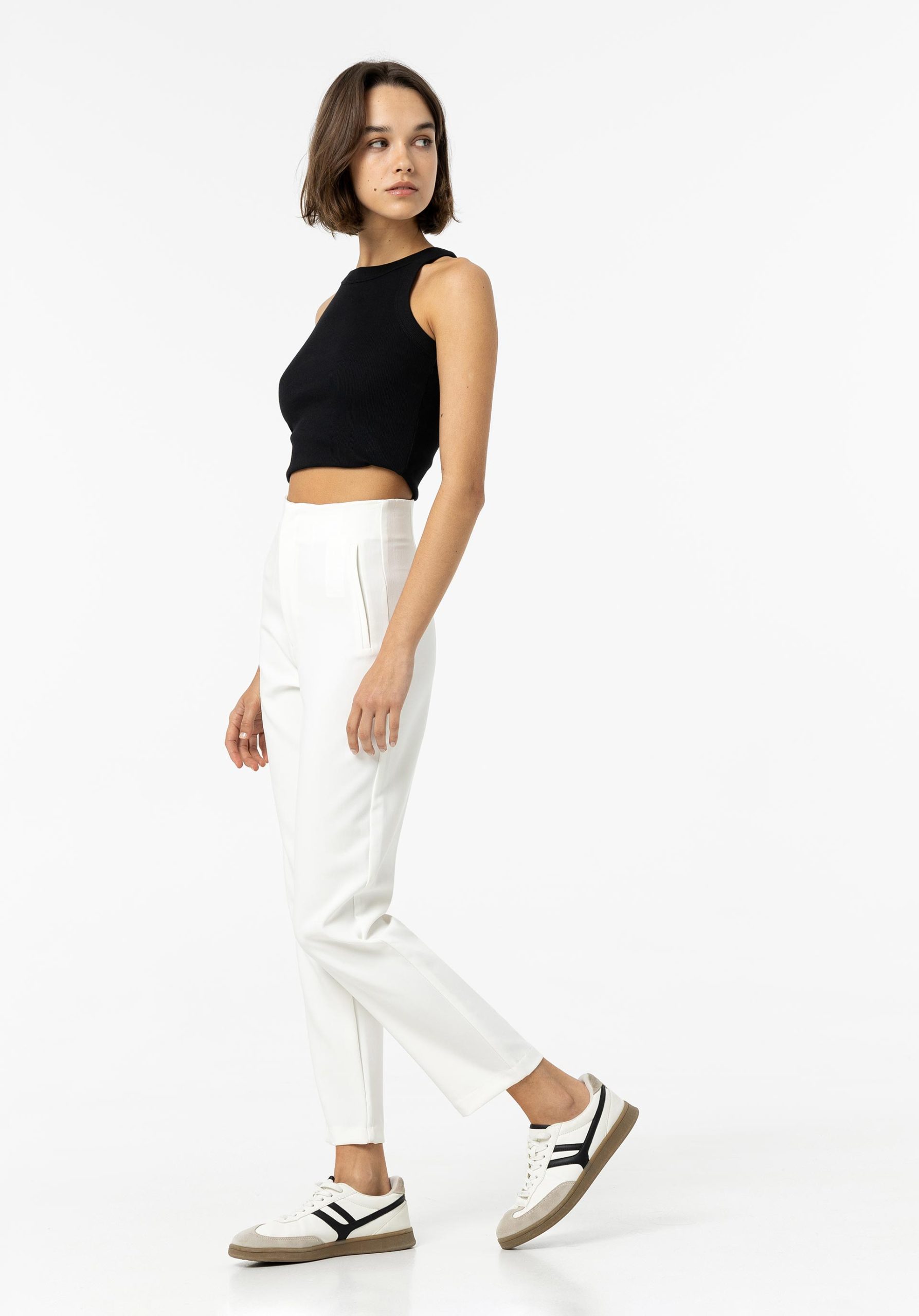Calças de cintura alta com bolsos falsos laterais. Fecho frontal de correr, gancho e botão no interior.