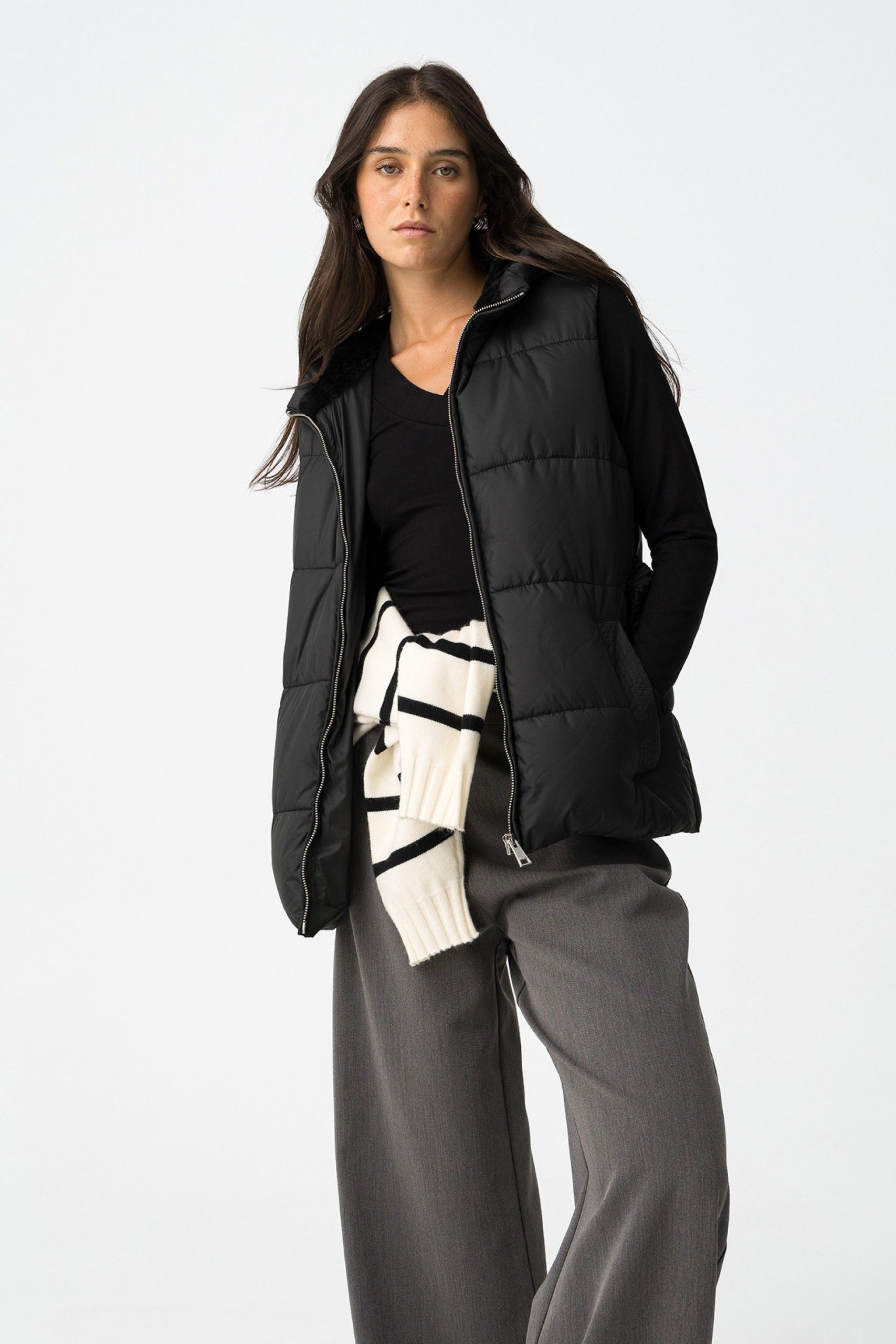 Colete acolchoado regular fit, com cinto elástico removível, dois bolsos frontais, capuz, manga cava e fecho de correr frontal.