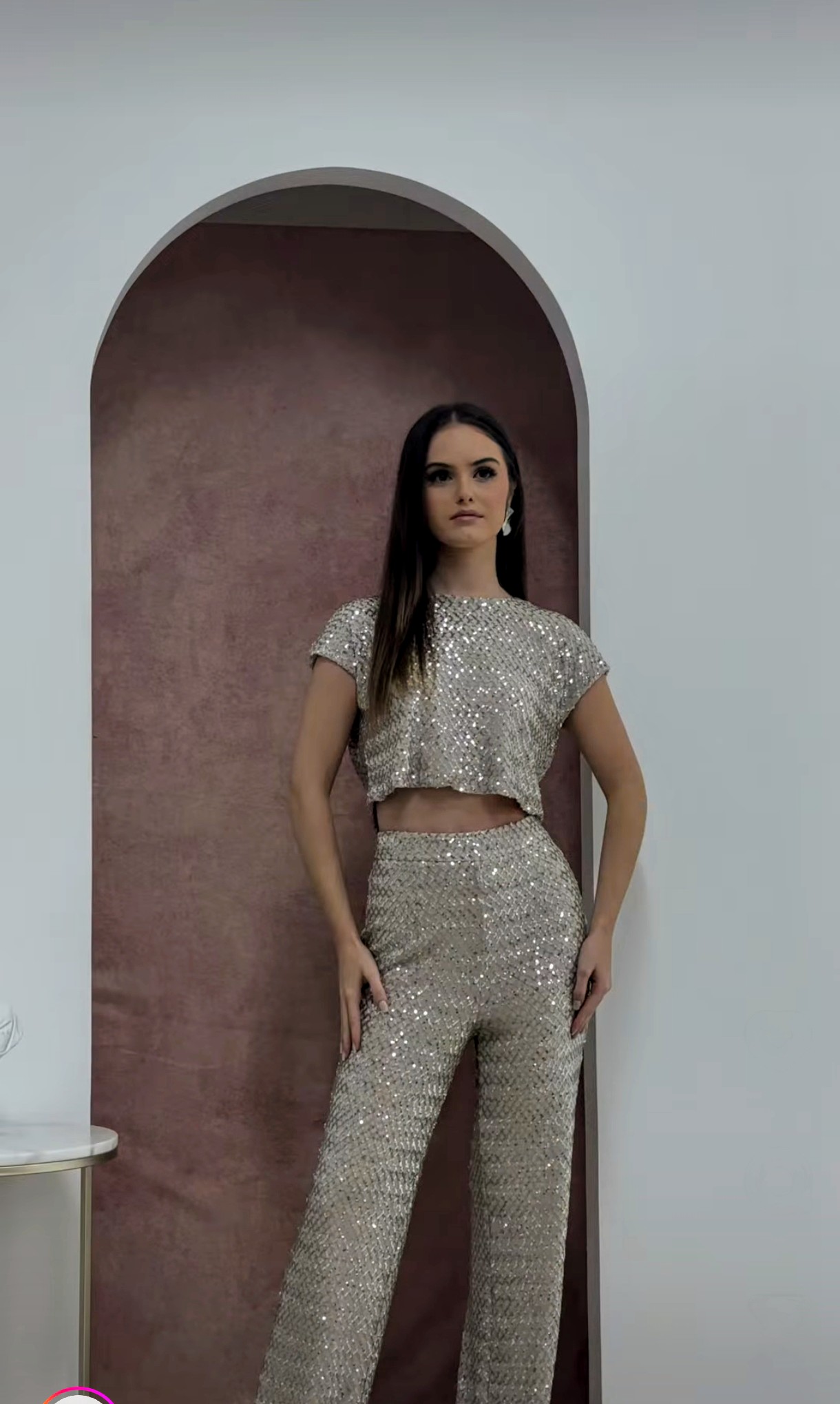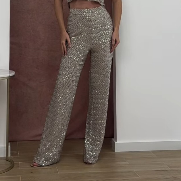 Calças elegantes de corte reto, repletas de lantejoulas que refletem brilho subtil. Uma peça ideal para eventos especiais, proporcionando um visual sofisticado e moderno. O tecido leve assegura conforto e liberdade de movimento.