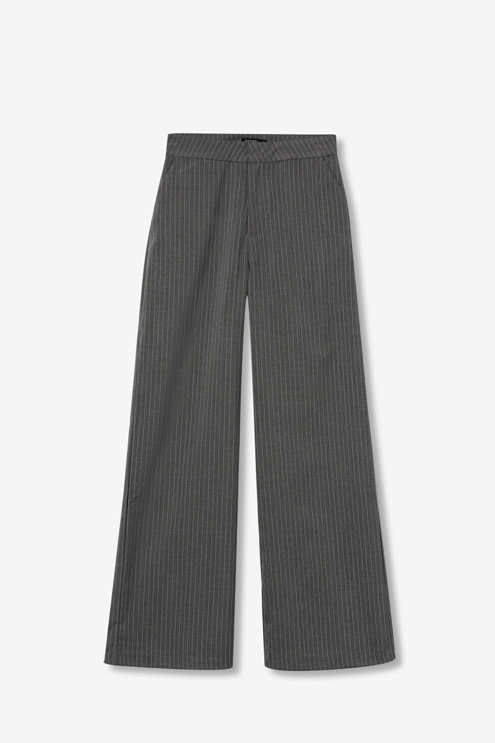 Calças straight fit às riscas, com dois bolsos, cintura alta e fecho de correr com gancho.