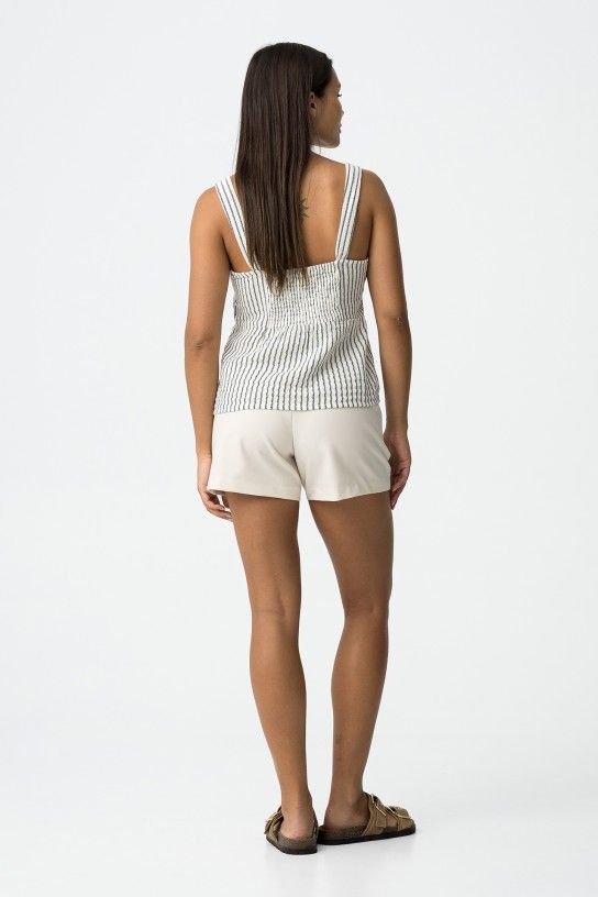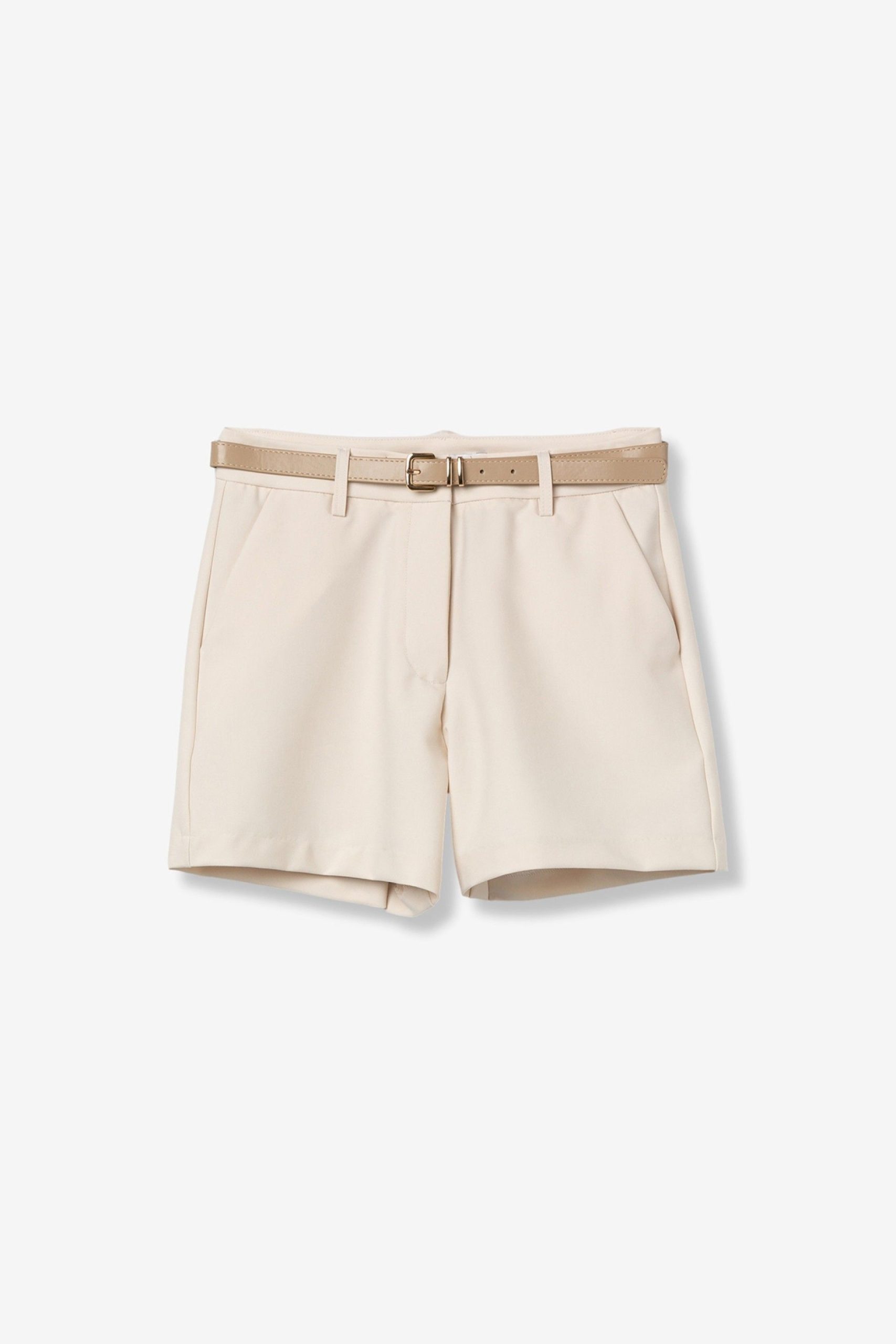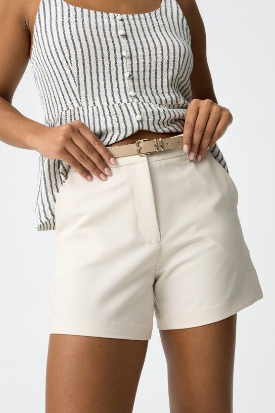 Calções curtos com cinto. Possuem corte direito, bolsos laterais discretos e fecho frontal. Uma peça clássica e versátil para diversas ocasiões.