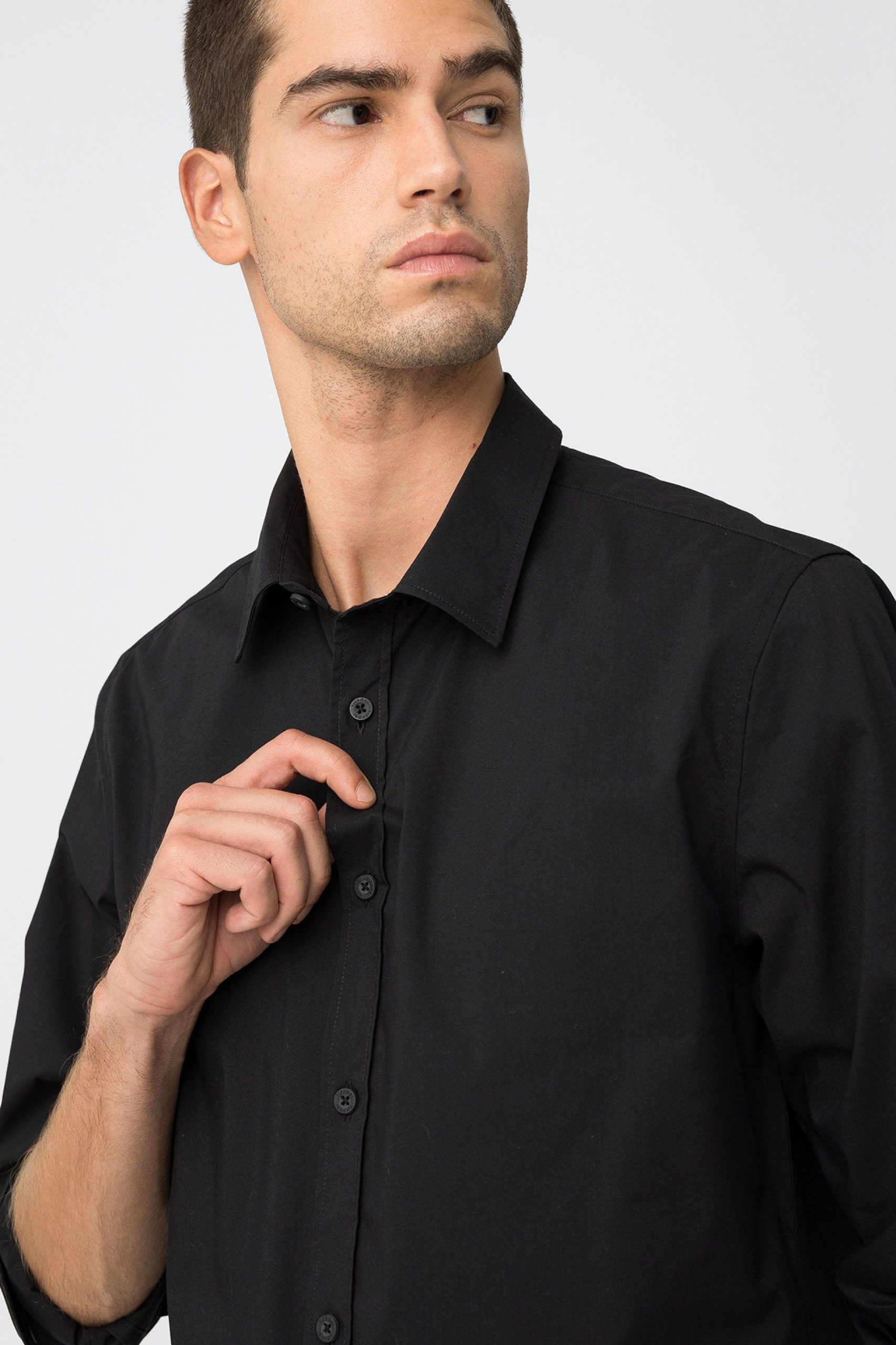 Camisa slim fit com tecido easy iron, gola colarinho, fecho de botão, manga longa com botões nos pulsos e bainha curva.