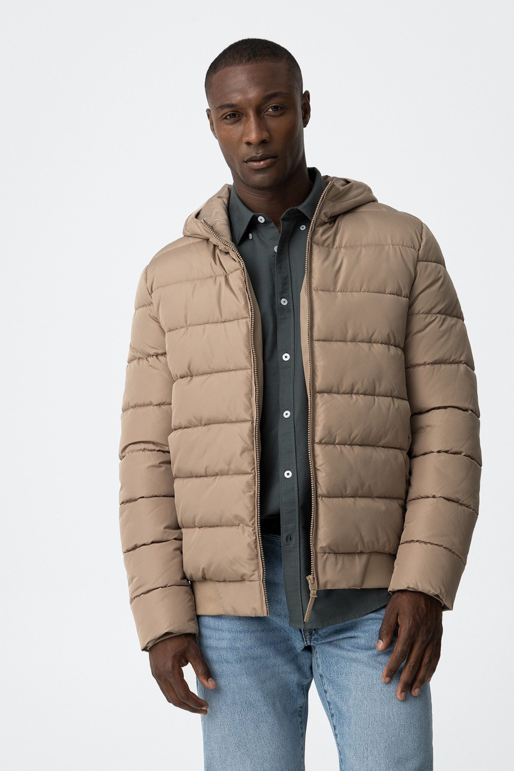 Casaco acolchoado resistente ao vento, com dois bolsos frontais e fecho de correr. Capuz, manga longa, terminações em rib e bolso interno.