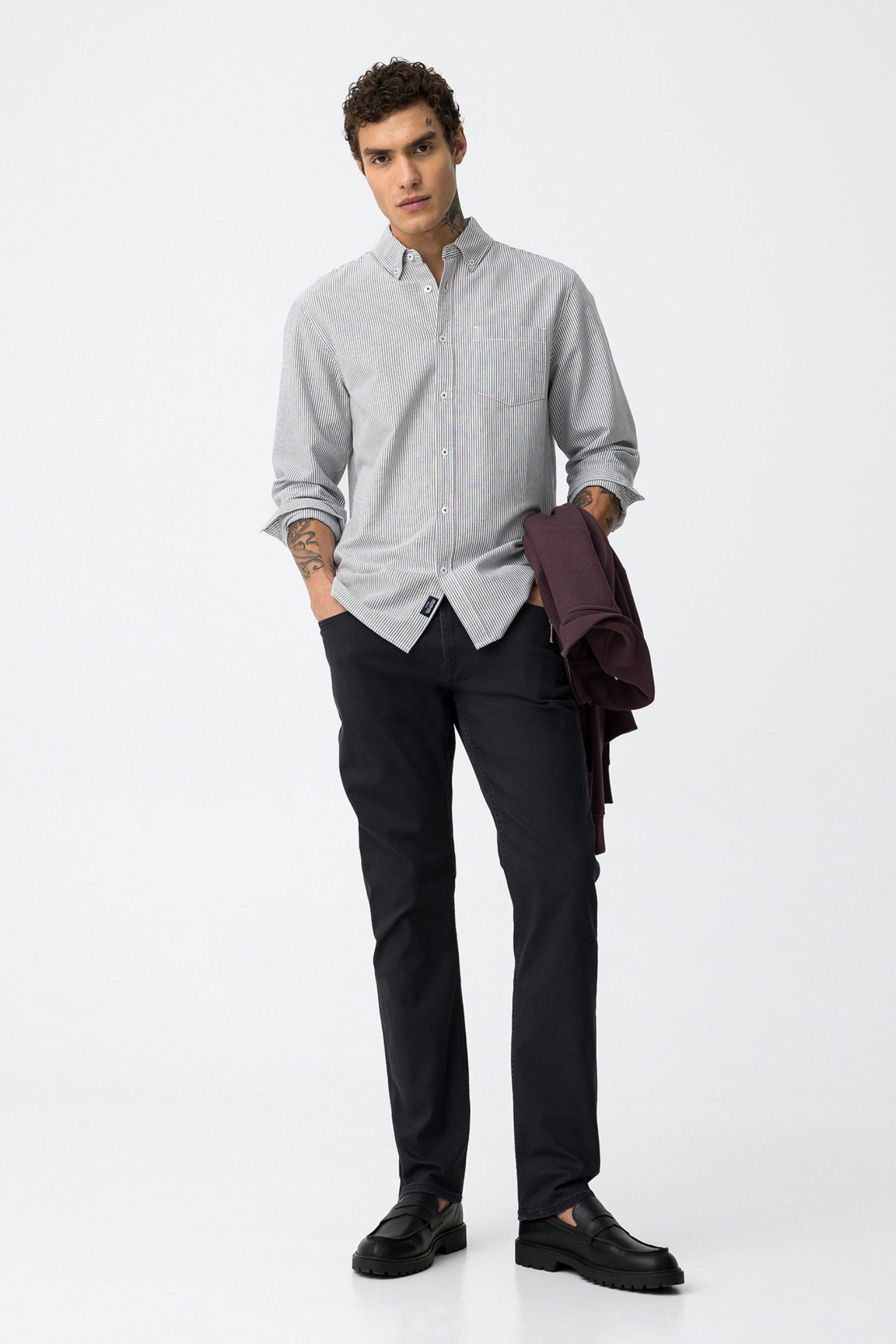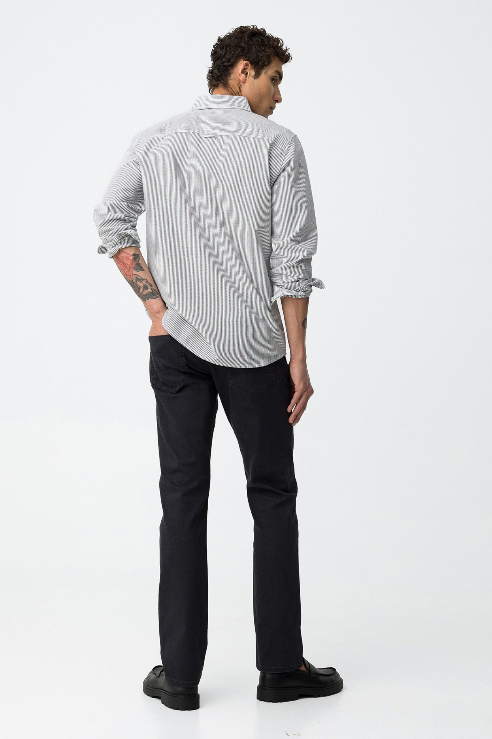Jeans com cinco bolsos, perna comfort e cintura média. Abertura frontal com fecho de correr e botão metálico.