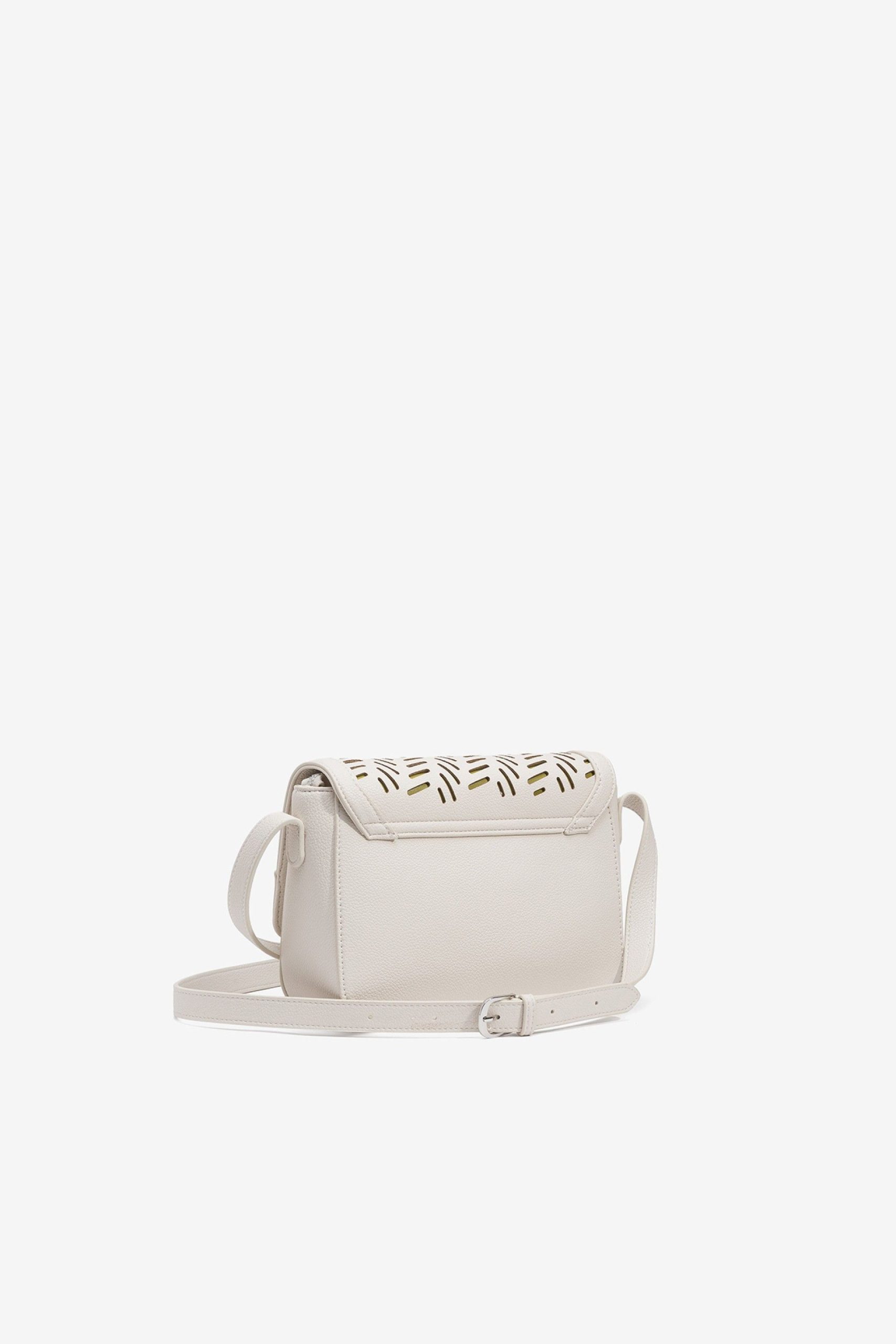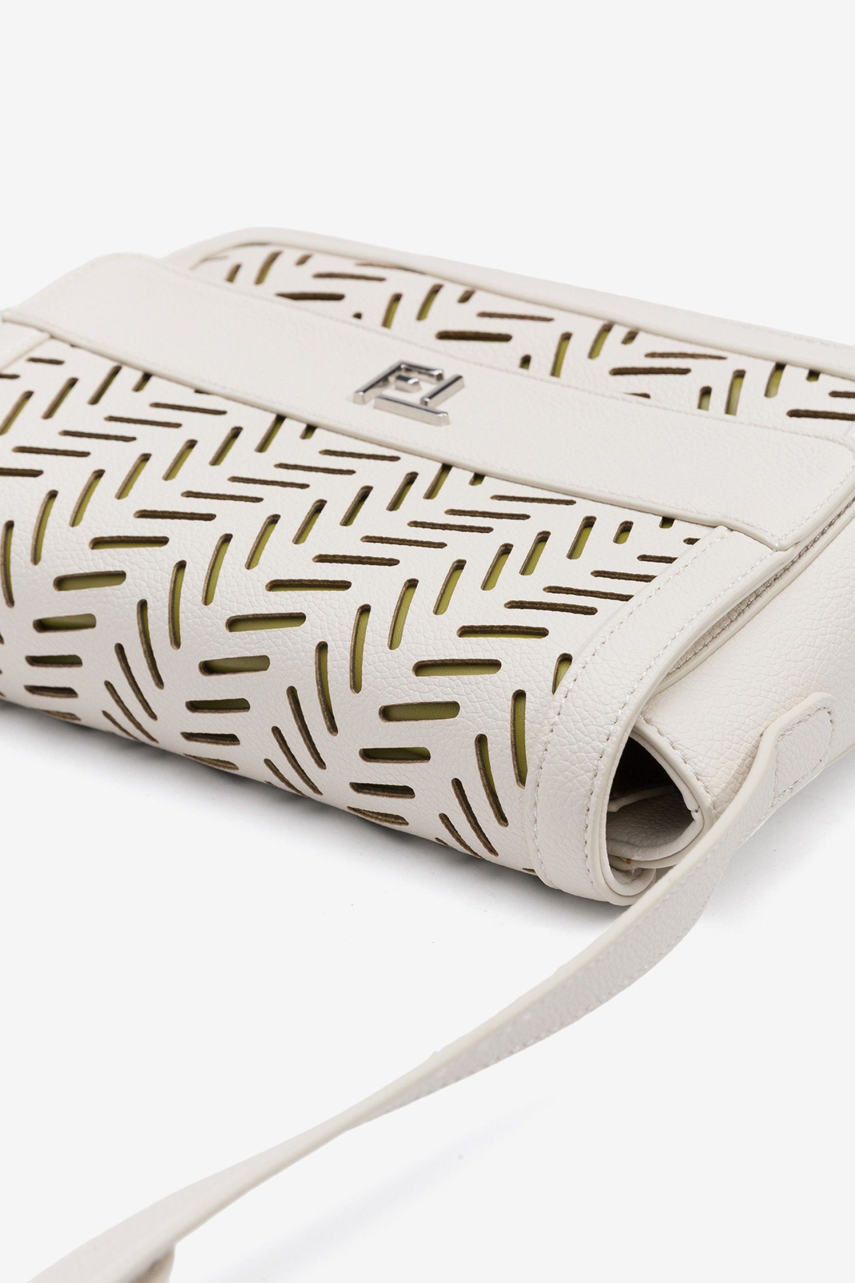 Mala bege com recortes geométricos, fecho metálico e alça ajustável. Interior espaçoso e prático.