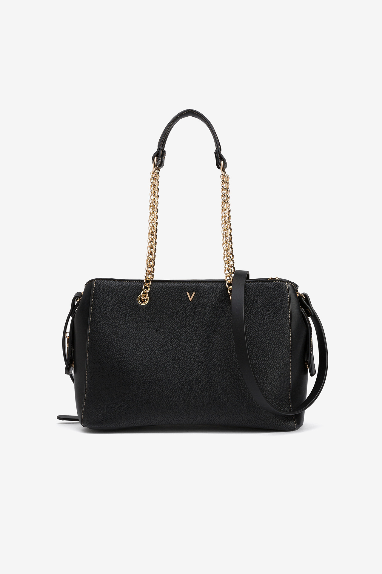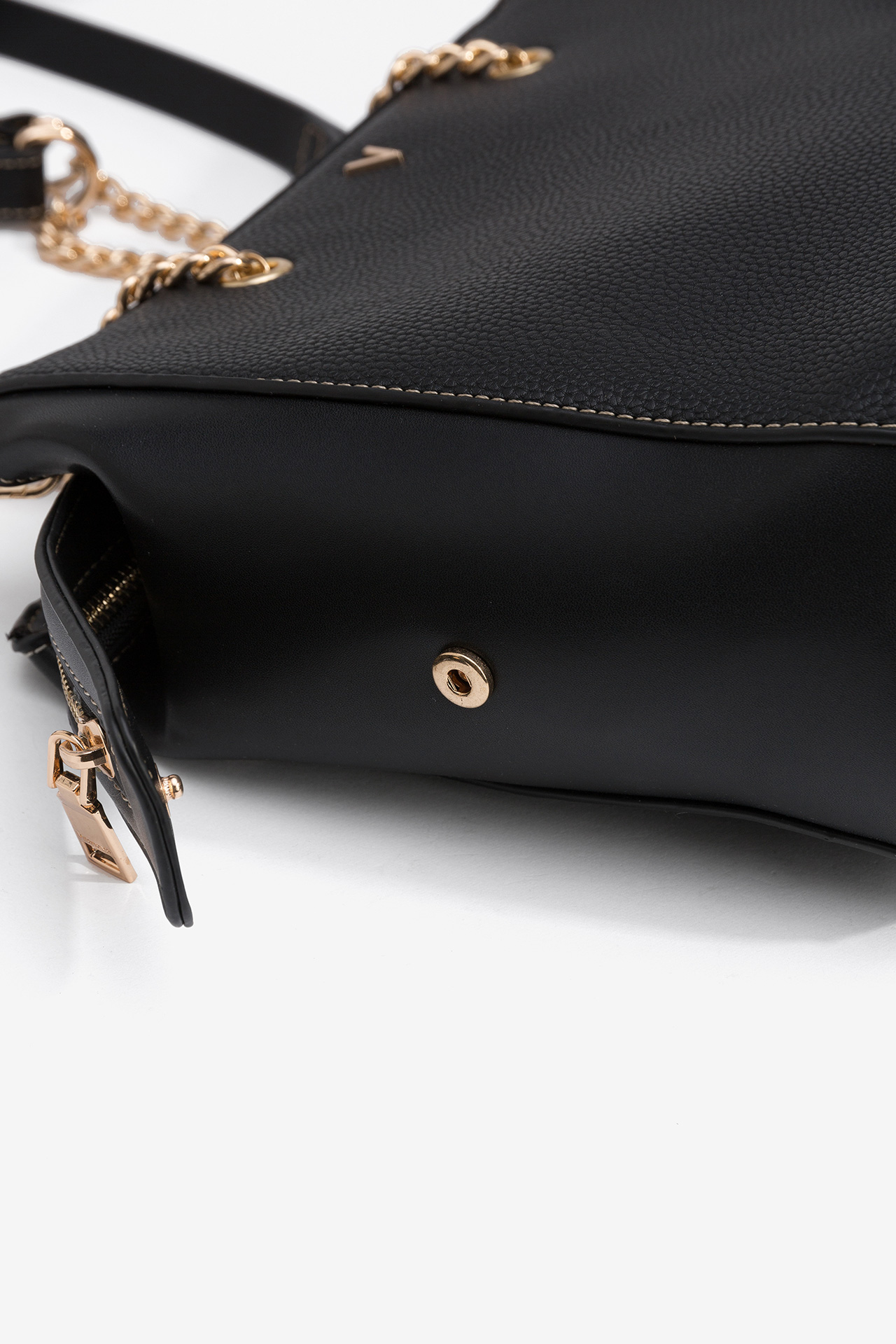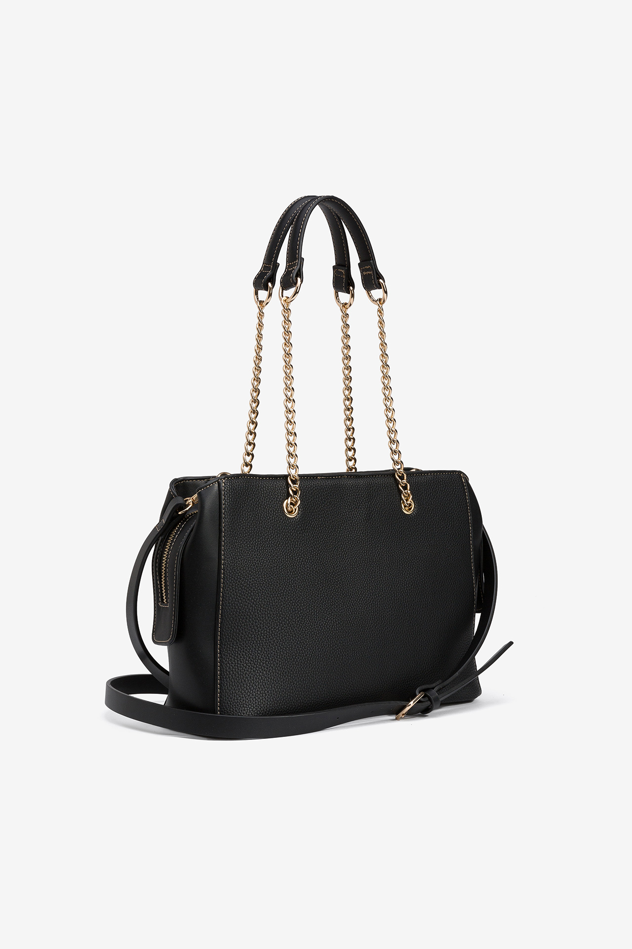 Mala city efeito pele com fecho de correr superior e alças combinadas com corrente. Alça tiracolo ajustável e removível. Bolso interno com fecho de correr. Tamanho médio. Dimensões: 30 x 21 x 9 cm